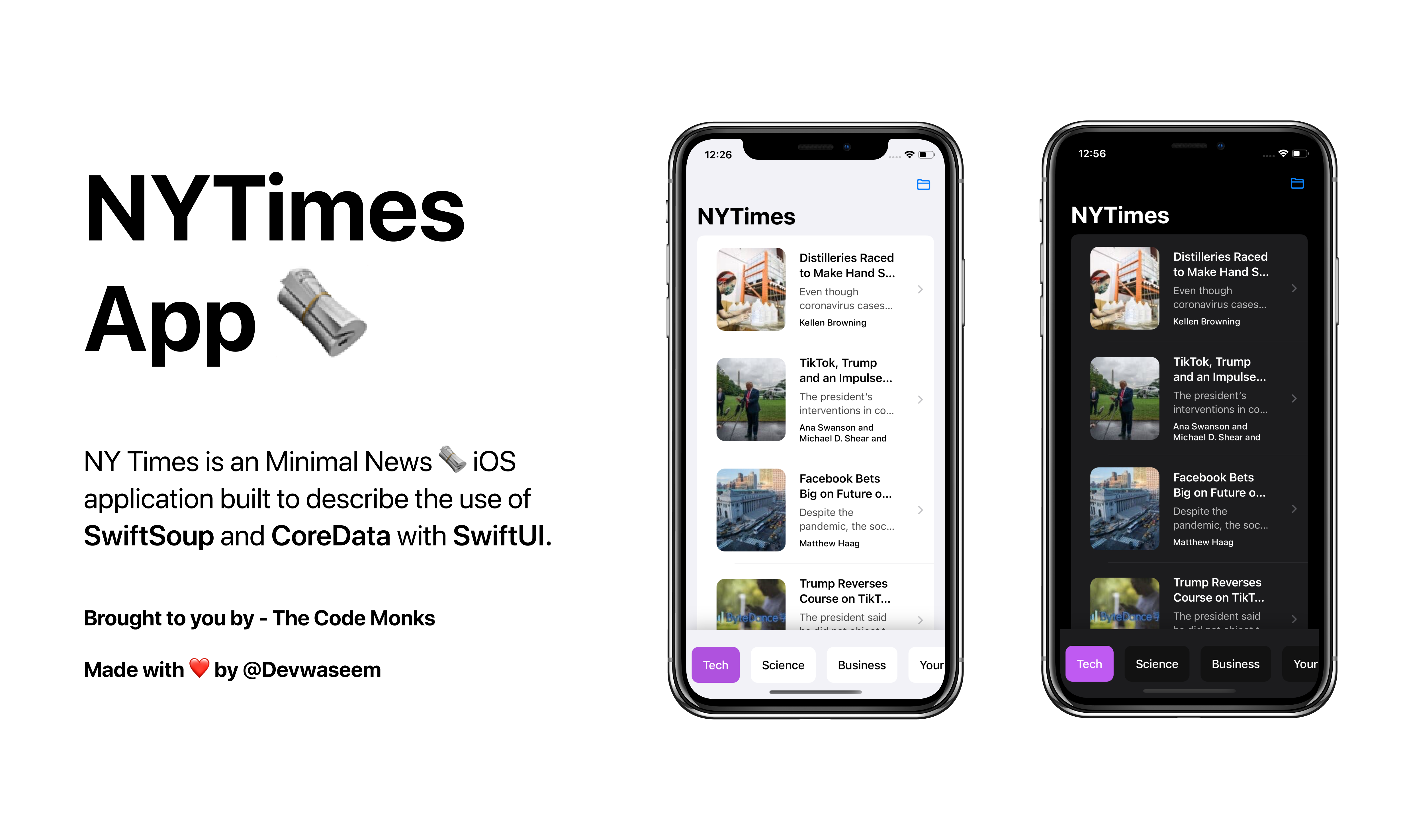 - News API apps: News app in the style of the NYT, CNN, BBC, Reddit, Twitter, Facebook - includes tvOS app, Today widget
