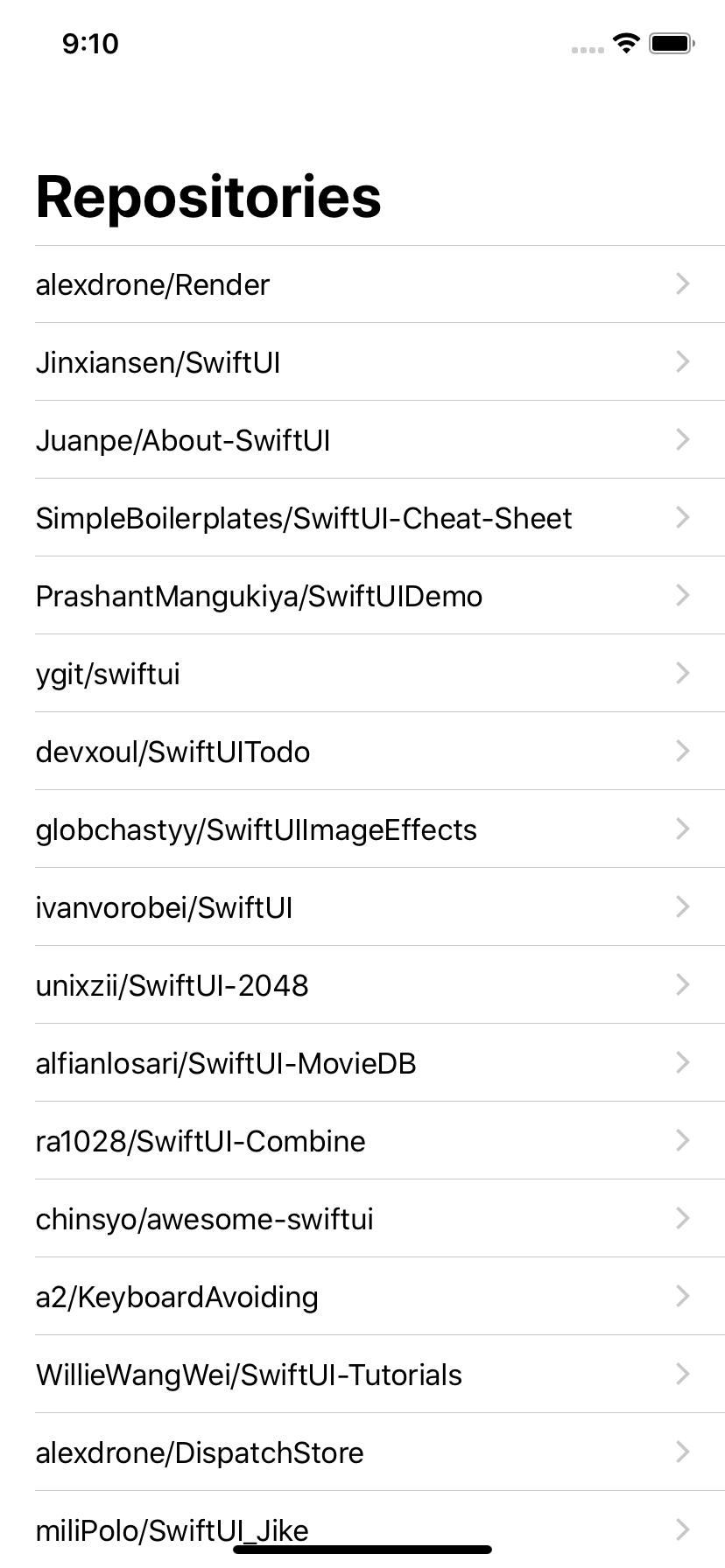 - Repositories: SwiftUI + Flux and Combine using GitHub API (Flux enables unidirectional data flow which is testable)